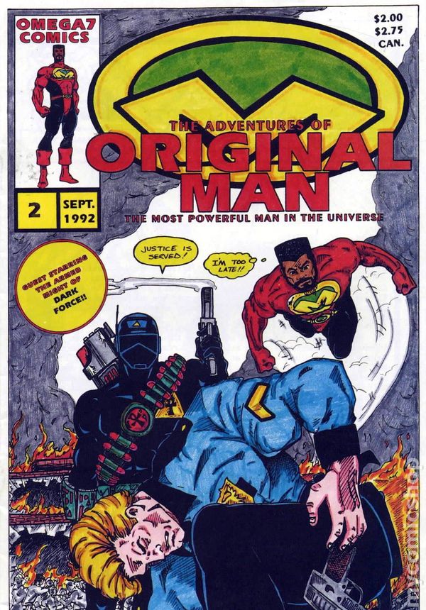 We then see Original Man lifting an oil tanker, to remove it from the line of fire, but while he is able to do so, he’s straining much harder than usual, again indicating that his powers are weakening. We then see this other character, a man in some high-powered armor, who calls himself Dark Force, He was briefly seen in the previous issue, observing Original Man from afar. While, during that time he’s left Kansas and is in L.A. too, and he’s seen mowing down a bunch of cops with his gun. Original Man flies down to stop him, but then both of them get blasted and knocked out by the Venturian, whose just arrived with Bongo and Nuclear Newt. But then suddenly a new hero materializes out of nowwhere. It’s Sheba Kamera, yep the woman Original Man was thinking of, and she has superpowers and costume too, and calls herself Original Woman, and she joins the fight. TO BE CONTINUED…