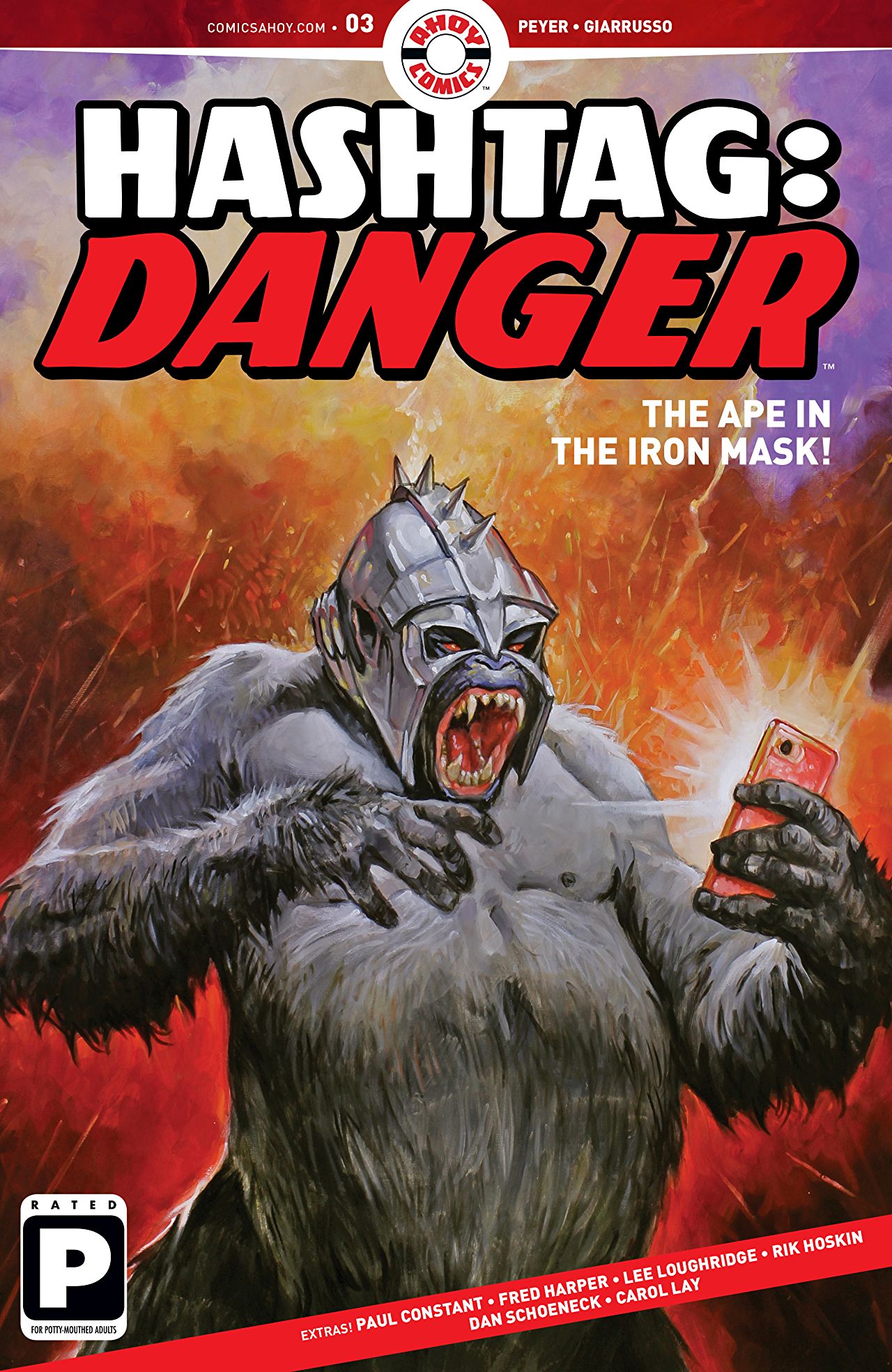 As revealed at the end of the previous issue, Desiree got the bright idea that in order to become more famous, Hashtag Danger needs to actively recruit some supervillains to fight. This issue opens with their headquarters at Danger Island under attack, but the villain turns out to be extremely ineffectual and easily defeated, which just makes Desiree mad. So Einstein claims that he knows of a supervillain that they can fight: a super-intelligent ape who lives on the moon. The trio, along with the baby yeti, hop into the Thrillride and fly off into space towards the moon. But because of the distance it still takes about 50 hours to get there. During the trip, Einstein reveals the secret background of the ape, which involves conspiracy theories involving ancient aliens who built the pyramids on Earth, the Hollow Earth theory, and the belief that the Neil Armstrong moon-landing was faked. Both Desiree and Sugar Rae think this is all nonsense, but Einstein is very confident. But when they finally arrive on the moon, the mission is not what Einstein expected.