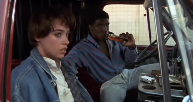 Next, we see Melissa walking home from the grocery store when she’s followed and then jumped by four of the Pocos. Despite knowing who she is, the Pocos apparently have no loyalty towards Rick and proceed to attempt to rape her, but she’s saved by the timely arrival of B.T., a local Black drug dealer whom we’d earlier seen flirting with Melissa at the high school, even though he knew she had a boyfriend. B.T. (played by Clyde Risley Jones, credited as Clyde R. Jones), convinces the Pocos to leave Melissa alone and he takes her away. She’s understandably shaken up by the experience, so he gives her some whiskey followed by a line of cocaine to calm her down. Later he takes her with him to a party, where he gets her to smoke crack and then takes her into the back of his van where they have sex.
