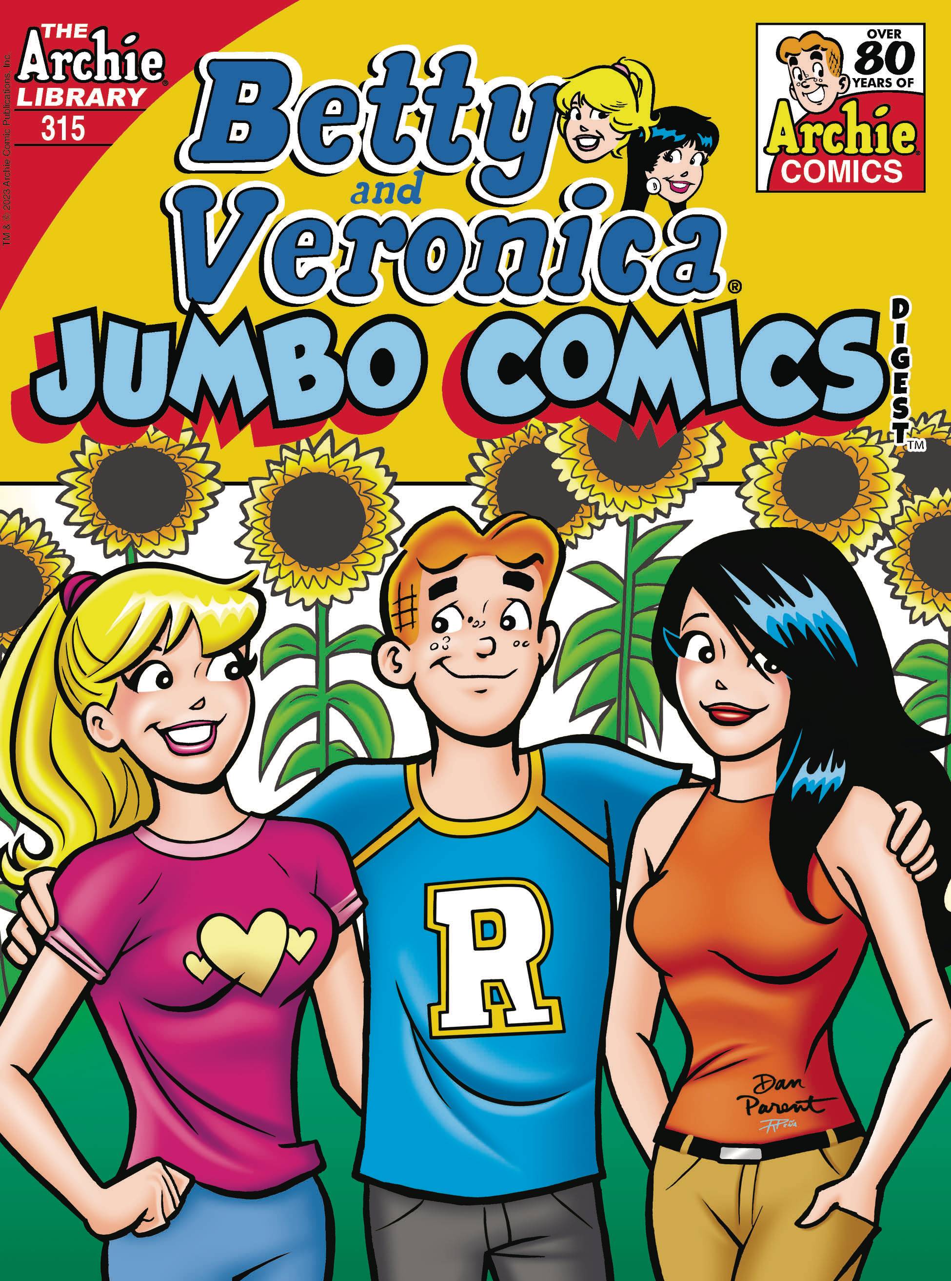 The other new story in this digest is written and illustrated by Dan Parent, and it’s a 5-page Big Ethel story titled Just Beach-y! Ethel and a girl named Cassie are on the beach playing volleyball against Betty and Veronica. The girls each notice some boys on the beach that they’re interested in, and Ethel comes up with the idea of deliberately hitting each boy with the volleyball and pretending it’s an accident, so the girls will have an excuse to talk to them. Veronica and Cassie aren’t so good with the ball, so it’s up to Ethel to do the job, hitting the ball to a boy named Tony, who Veronica is interested in, and then to a boy named Brad, who Cassie is interested in. Then it’s Ethel’s turn to hit a boy named Kai, whom she’s interested in. But Ethel’s strength makes it not so easy.