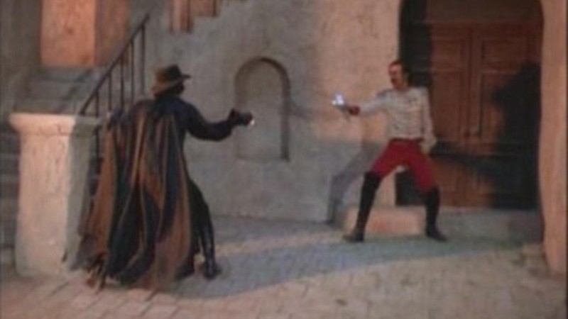 At night, Zorro breaks into the hacienda again and steals the tax money from Bonasario. Esteban tries to catch him, and the two have an extended sword fight, which Zorro wins, and then challenges him to another duel the next day. Zorro gives the money to Frey Felipe and tells him to give it back to the peasants. He then sneaks into Maria’s room and seduces her, keeping his mask on.