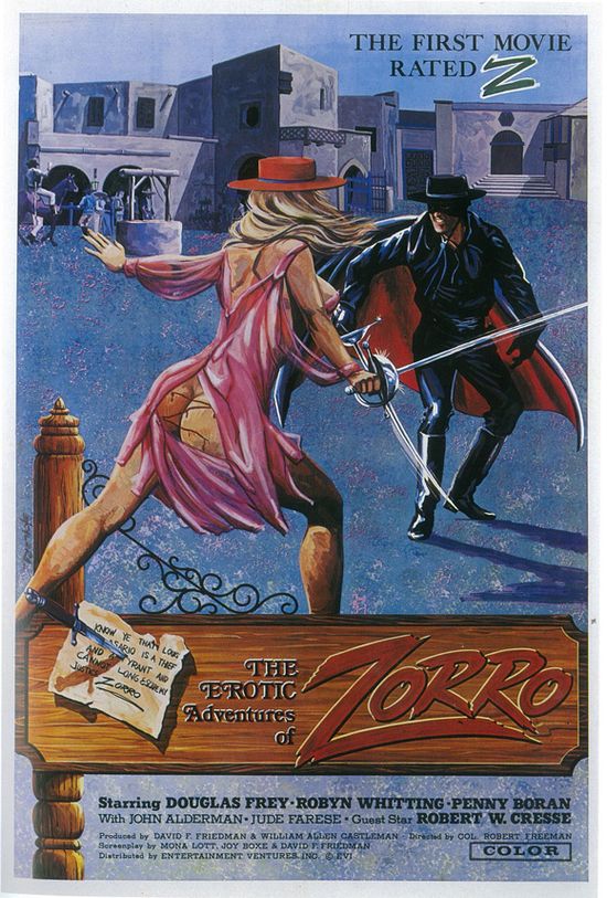 Released in 1972, this film is also known as The Sexcapades of Don Diego, and it was directed by Col Robert Freeman who is also credited with the “original story”, which was scripted by David F. Friedman, Mona Lott and Joy Boxe (I have to assume those last two names are fake). I don’t know how this film got made, as the character was not in the public domain at this point and this is clearly not authorized by the Zorro corporation, they don’t even give a token credit to Zorro creator Johnston McCulley. But here we go.