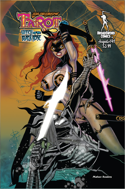 The issue is the conclusion of the three-part storyline that began in April. Picking up from the end of the previous issue, Tarot has tracked down the Cursed Swordsman and is so filled with anger over his brutal attack on Raven that she wants to kill him. But she can’t shake the feeling that her Goddess is responsible for the Swordsman’s curse and wonders if she’s really doing the right thing.