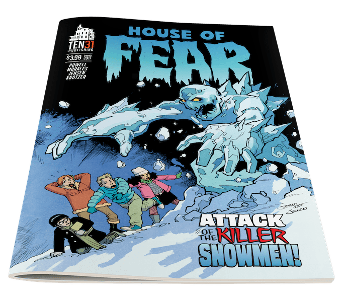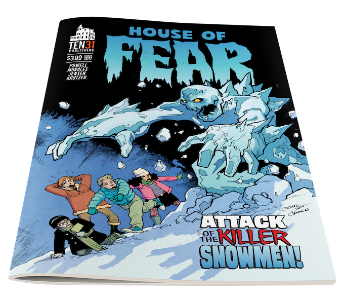 Written by James Powell and drawn by Jethro Morales, this is an all-ages horror comic. It takes place on a snowy winter day, as three kids, boys Wyatt and Tristian and a girl named Andi, are tossing a football around in the snow. It’s not clear how old any of them all, from the artwork I’d guess maybe 12-14. While tackling each other they accidentally run into and destroy a snowman that was built by a boy named Jacob. Apparently, he’s new in town and is considered a bit of an outcast. The kids apologize and offer to help rebuild his snowman, but he just storms off. Jacob was carrying a book in his hands, and Tristan remarks that he overheard him refer to it as a spellbook (and he’s drawn to show a slight resemblance to Harry Potter, I think).