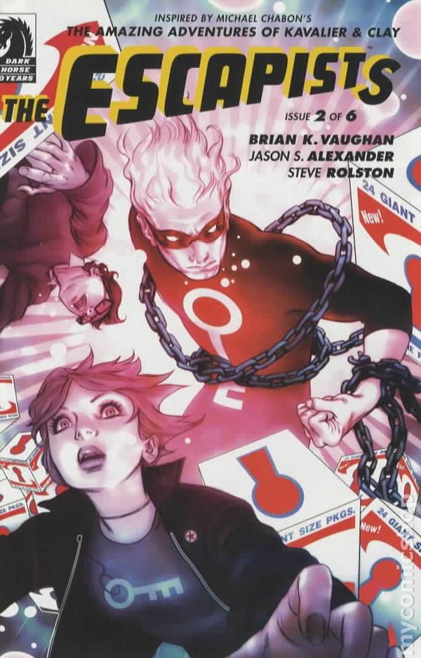 This issue takes place three months after the end of the first issue. Max, Case, and Denny have been working on their first issue of The Escapist and are finally finished. Max has a lot riding on this, as he’s now spent all of his inheritance money on getting the rights to the character and paying Case and Denny to help make it, so he is now broke (a fact which he is hiding from his friends), and really needs this series to succeed.